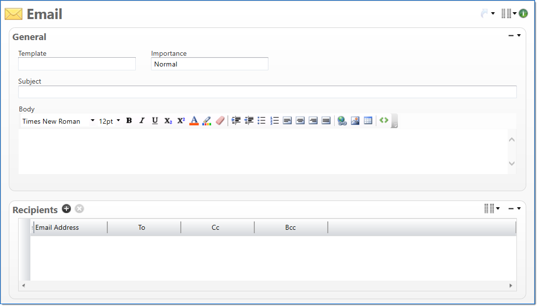 The Email screen allows you to send emails from BST11. From this screen, you can compose an email, apply an email template, add recipients, and send a manual email from the system. In addition, attachments can be added to emails; for more information see Attachments.