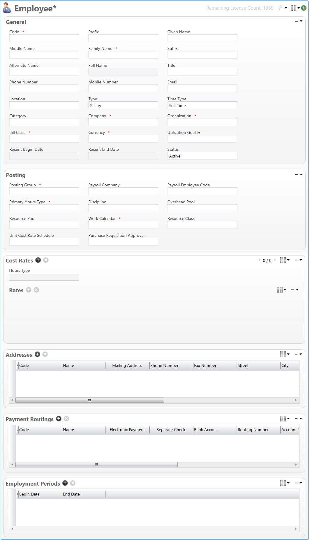 Before a new, active employee can be submitted, the system checks to ensure that the number of active employees does not exceed the total number of available user licenses. A warning will be issued when the number of added employees is within ten percent (10%) of the total number of available licenses. For more information about this limitation, see License.