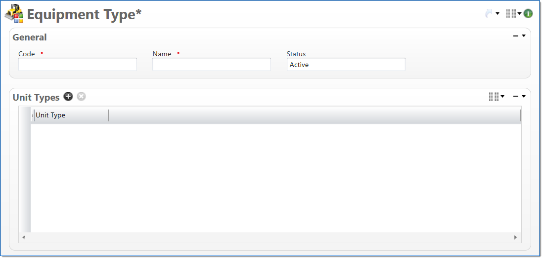 The Equipment Type screen allows you to add a category of company owned equipment. An equipment type is assigned to each Equipment code in the system and is used to group types of equipment. Unit types are associated with an equipment type, and when units are entered, the equipment type is limited by the unit type entered.