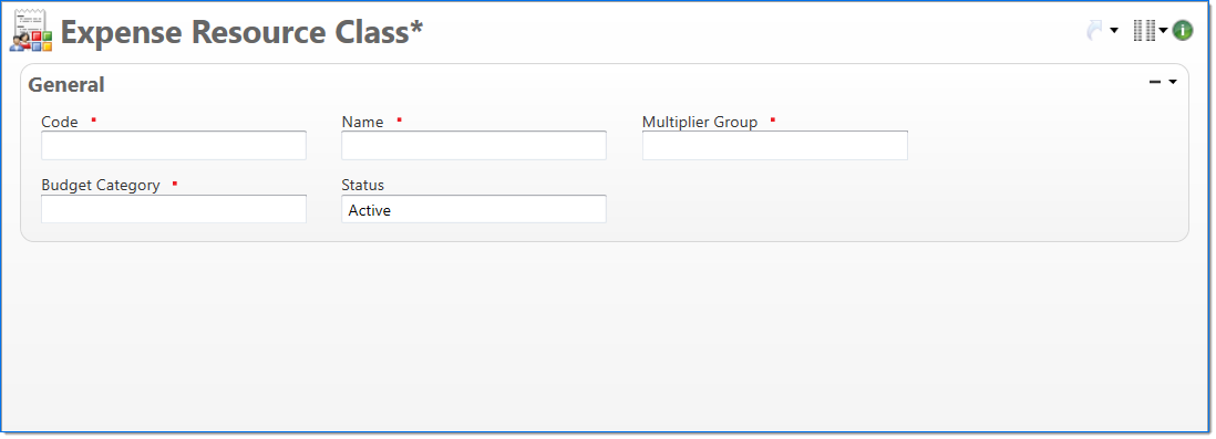 Code | Enter a unique code for the expense resource class. Once a code has been entered and submitted, it cannot be changed. |
