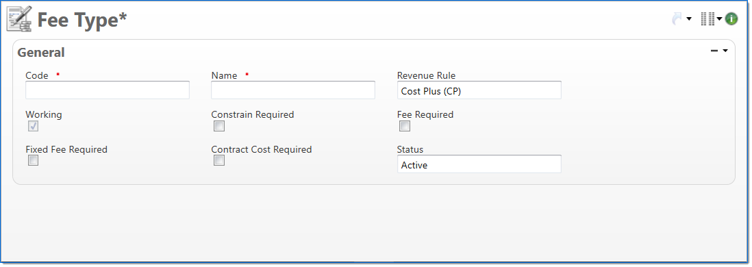 Revenue Rule | Select the revenue rule used to calculate revenue for the Fee Type. Available selections include: Non-chargeable (NC), Lump Sum (LS), Cost Plus (CP), and Cost Plus Max (CPM). This selection cannot be changed once the document has been in a final state. |
