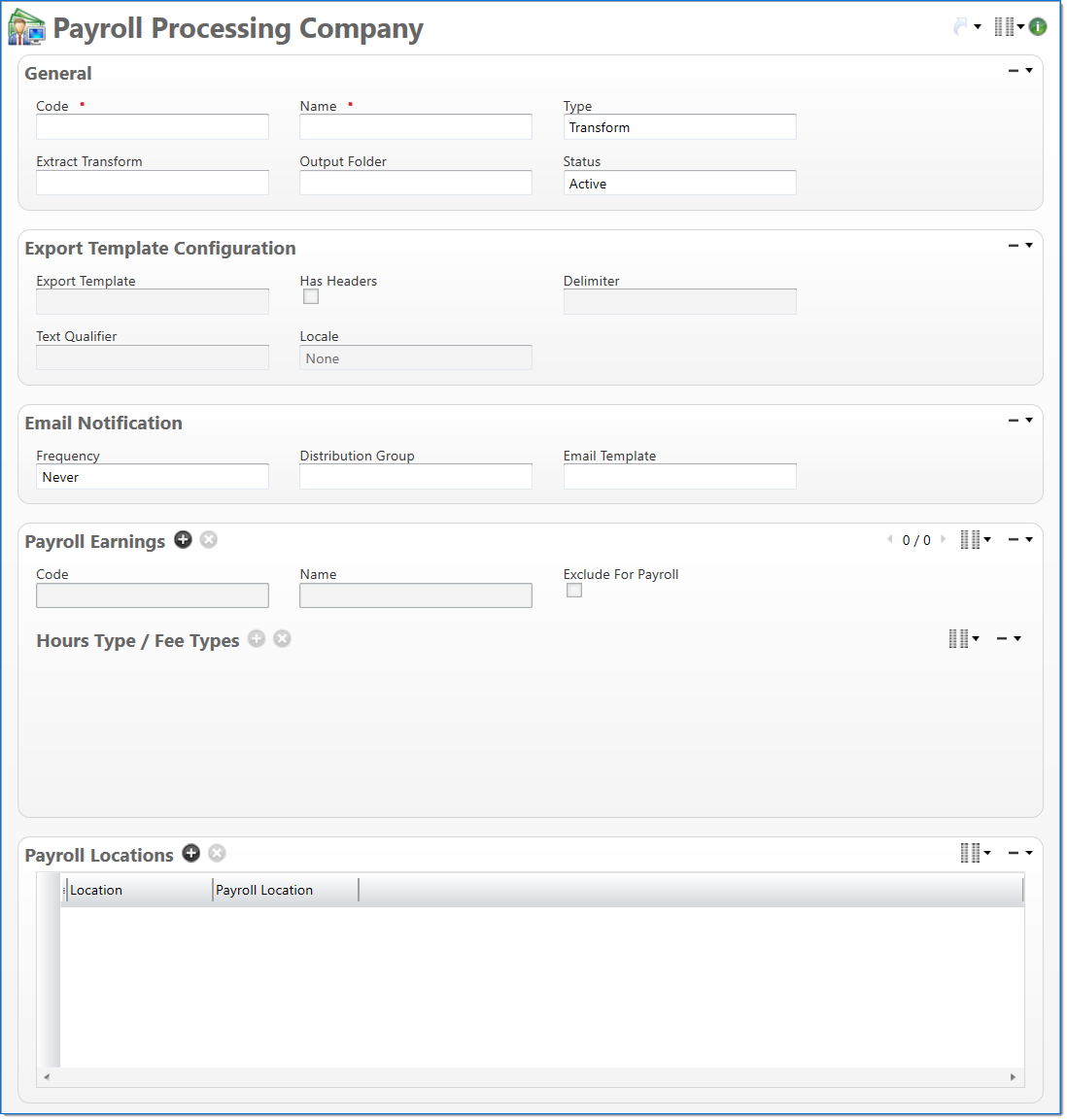 The Payroll Processing Company screen allows you to add and define the processing companies used to physically calculate payroll. Typically, these companies are external payroll processing services or third-party software installed locally to do payroll processing. Examples of payroll processing companies might be the ADP or PayChex service companies or payroll software such as the ABRA product.