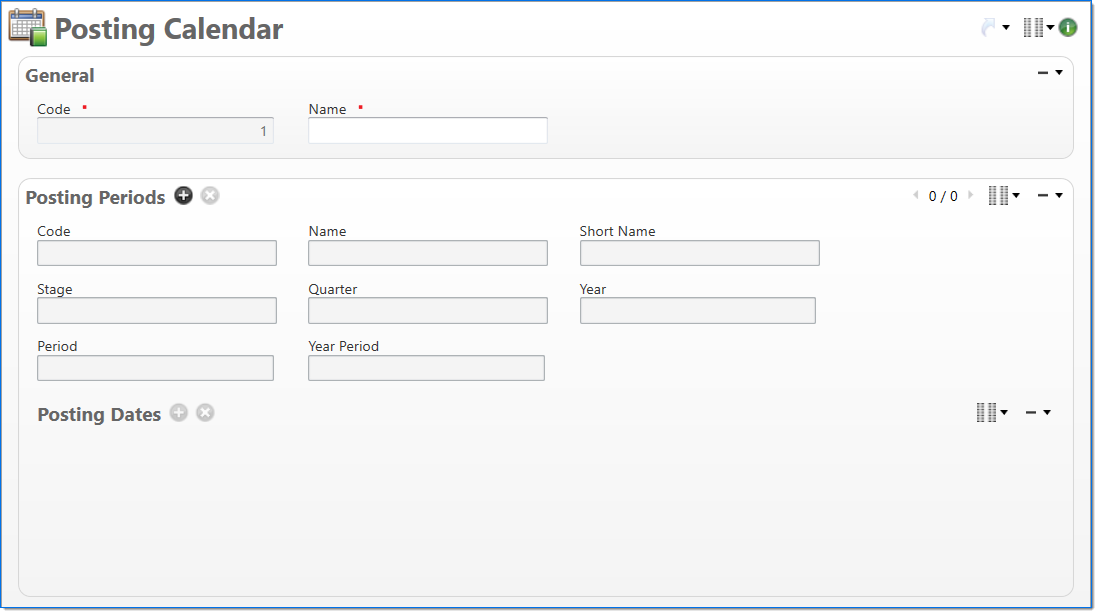 Code | Displays 1 as the default code for the posting calendar. This value cannot be changed. |