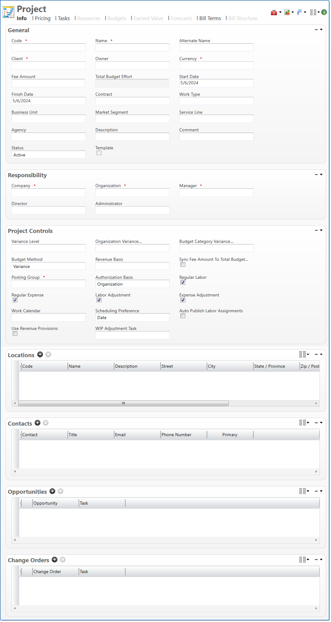 | Director | Enter or select the project director. This can be used for various roles above project manager. Only active and pending active employees can be selected. | |