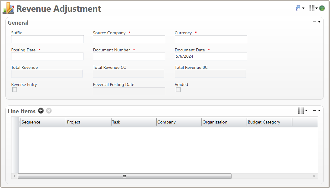In the Line Items area, enter the detail lines. Each line item contains a revenue amount to adjust on the project specified. The selections in Project, Task, Company, and Organization must be valid in relation to each other.