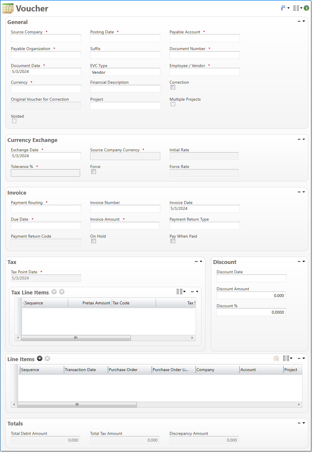 In the Discount area, record any discount that may be available if the voucher is paid by the discount date. This is only applicable for vendors and is read only for employees.