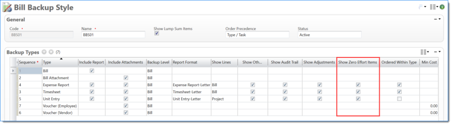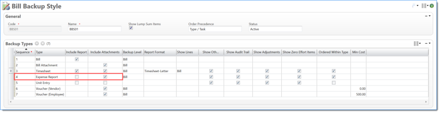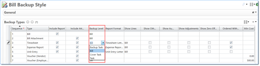 Bill Backup settings are determined by the Bill Backup Style document. The samples below illustrate how various Backup Types style settings affect timesheets, expense reports, and unit entries (as applicable).