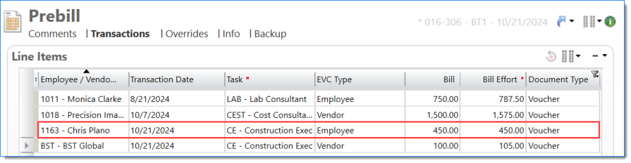 Example of Prebill Backup with one timesheet report per backup Bill Task, with transactions