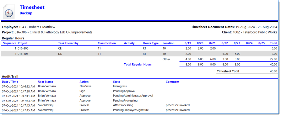 Example of Timesheet when Include Report is selected
